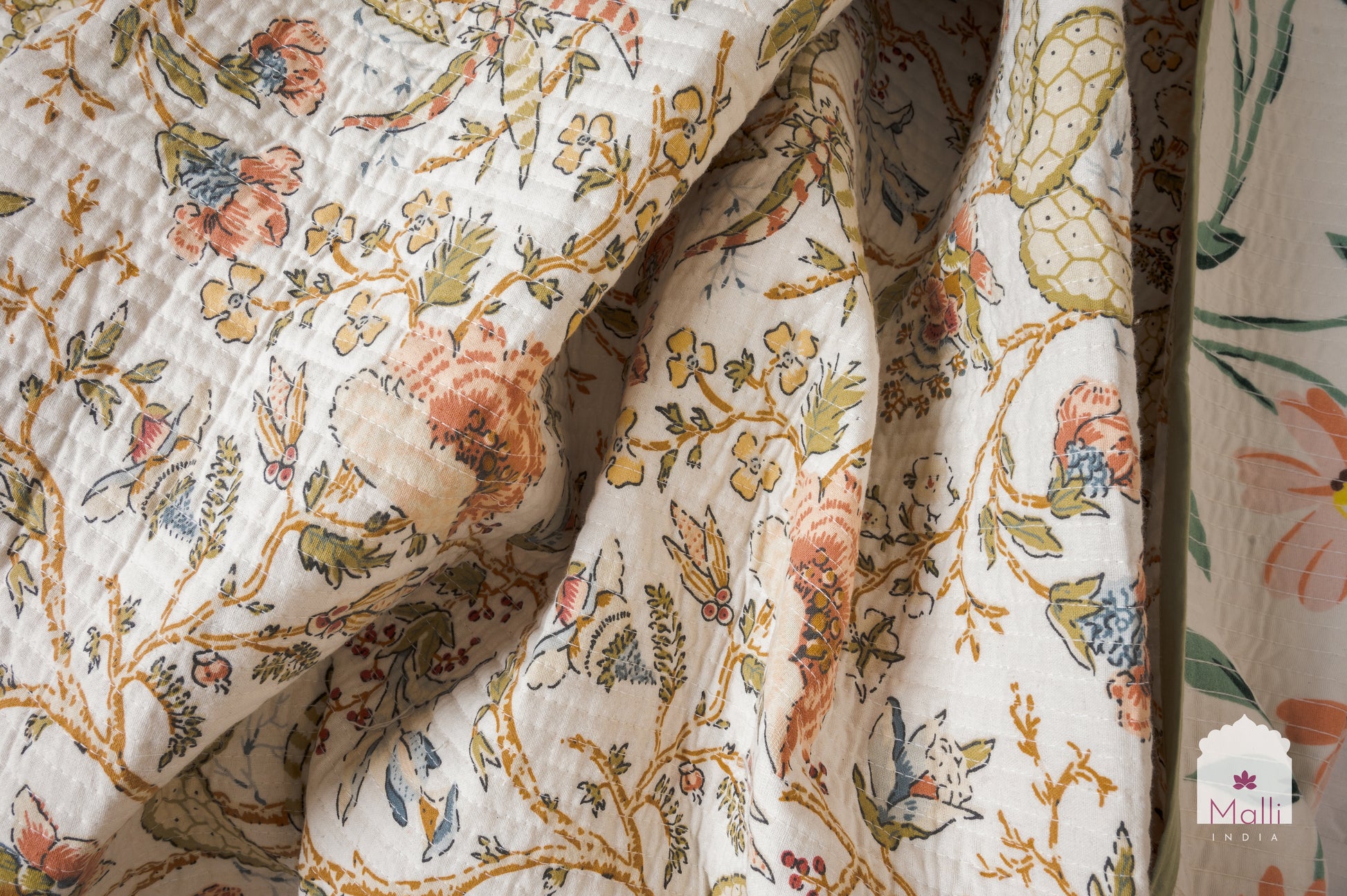 Rust orange bloom on cream base - Quilted reversible bedcover in pure cotton
