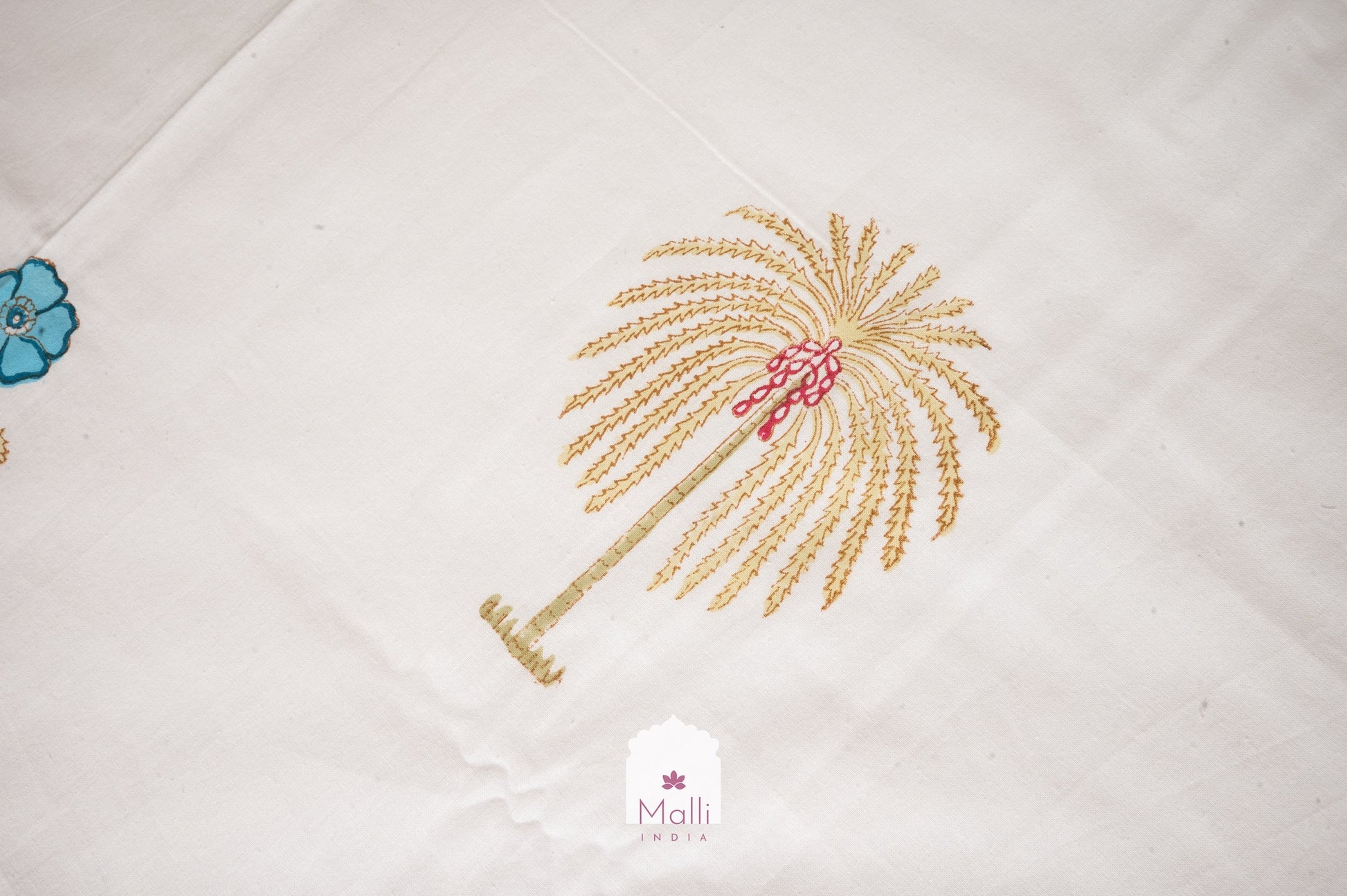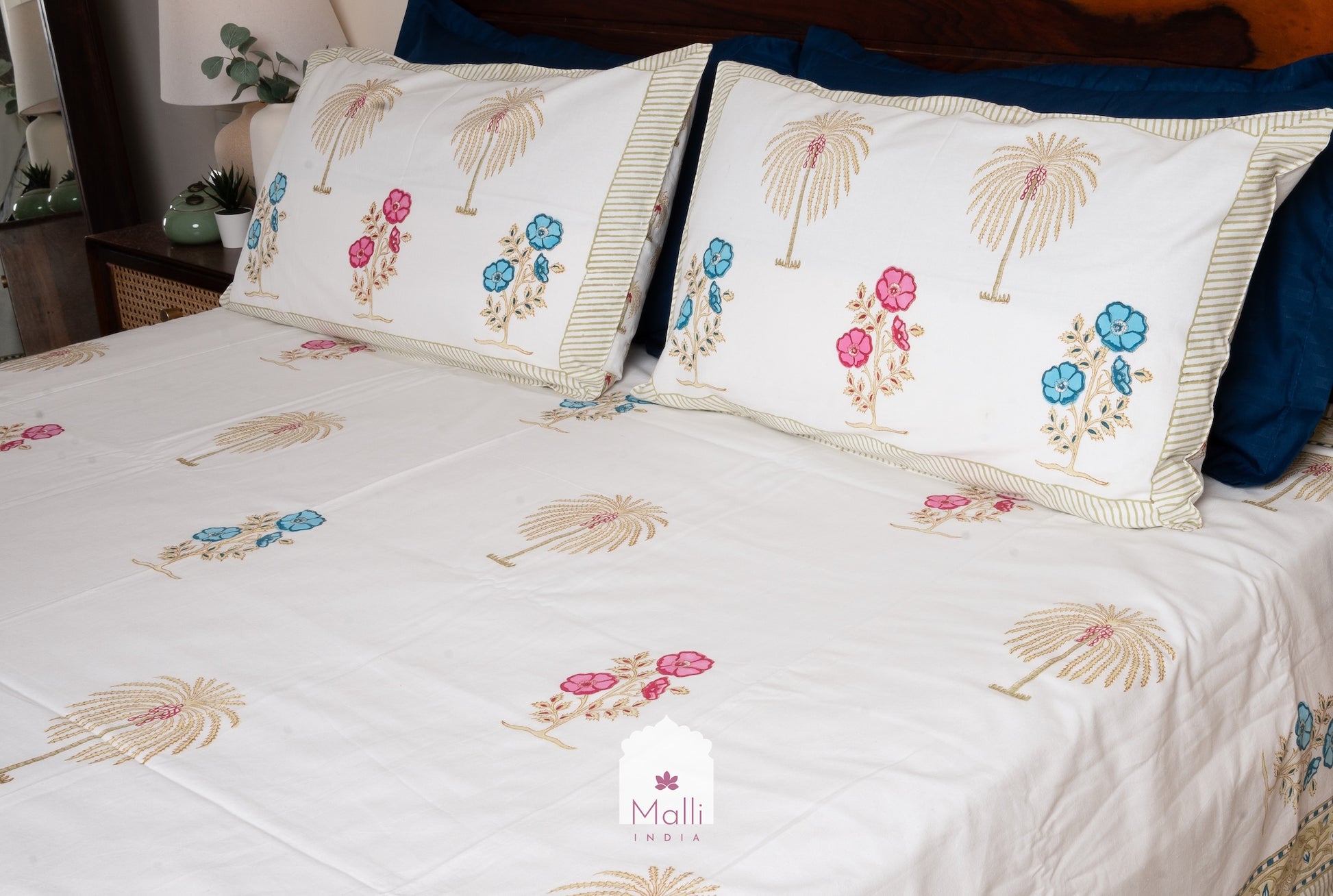 Blue pink florals & palm buti - Pure cotton double bedsheet handblock printed
