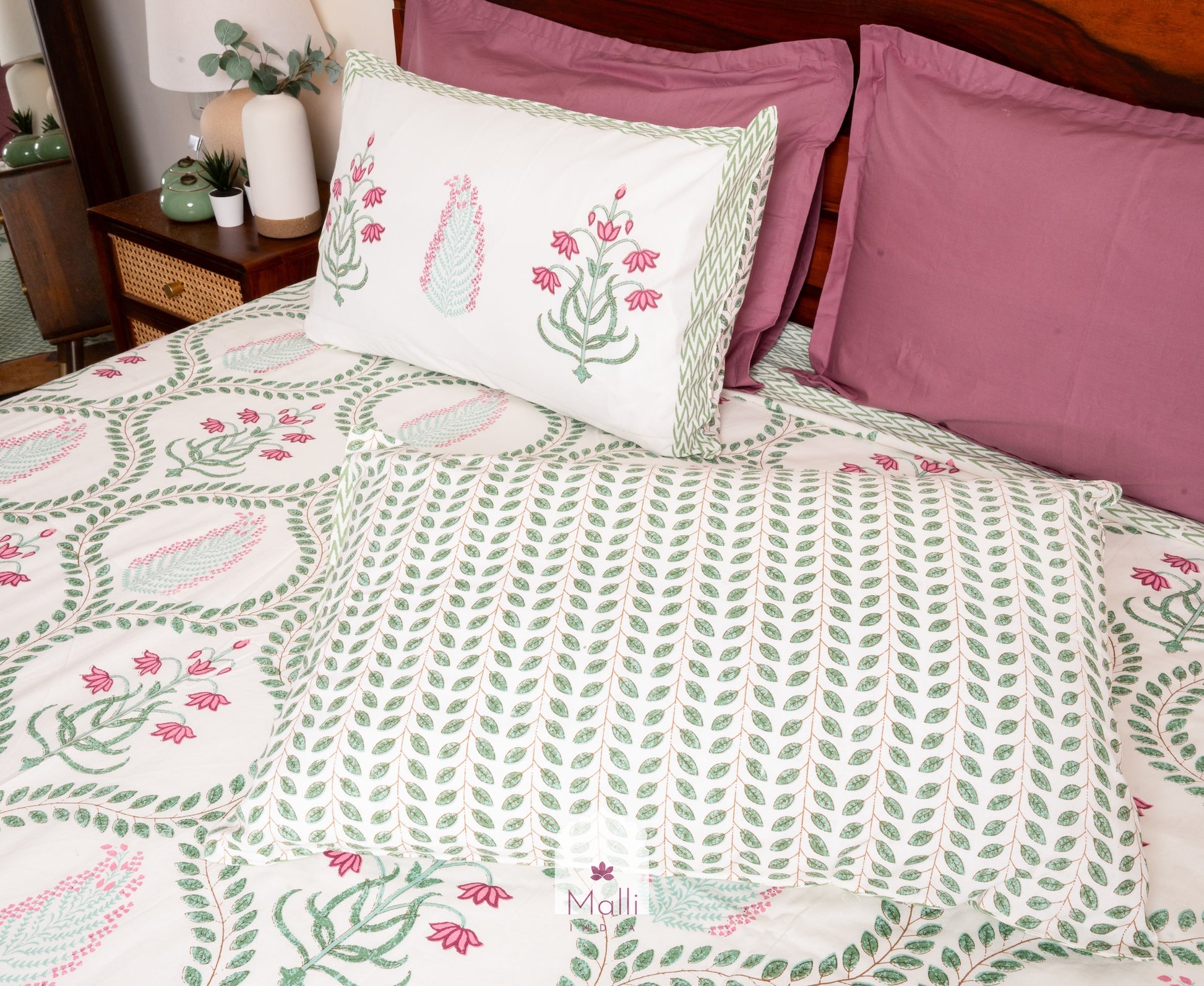 Mughal pink lotus in green leaf jaal - Pure cotton double bedsheet handblock printed