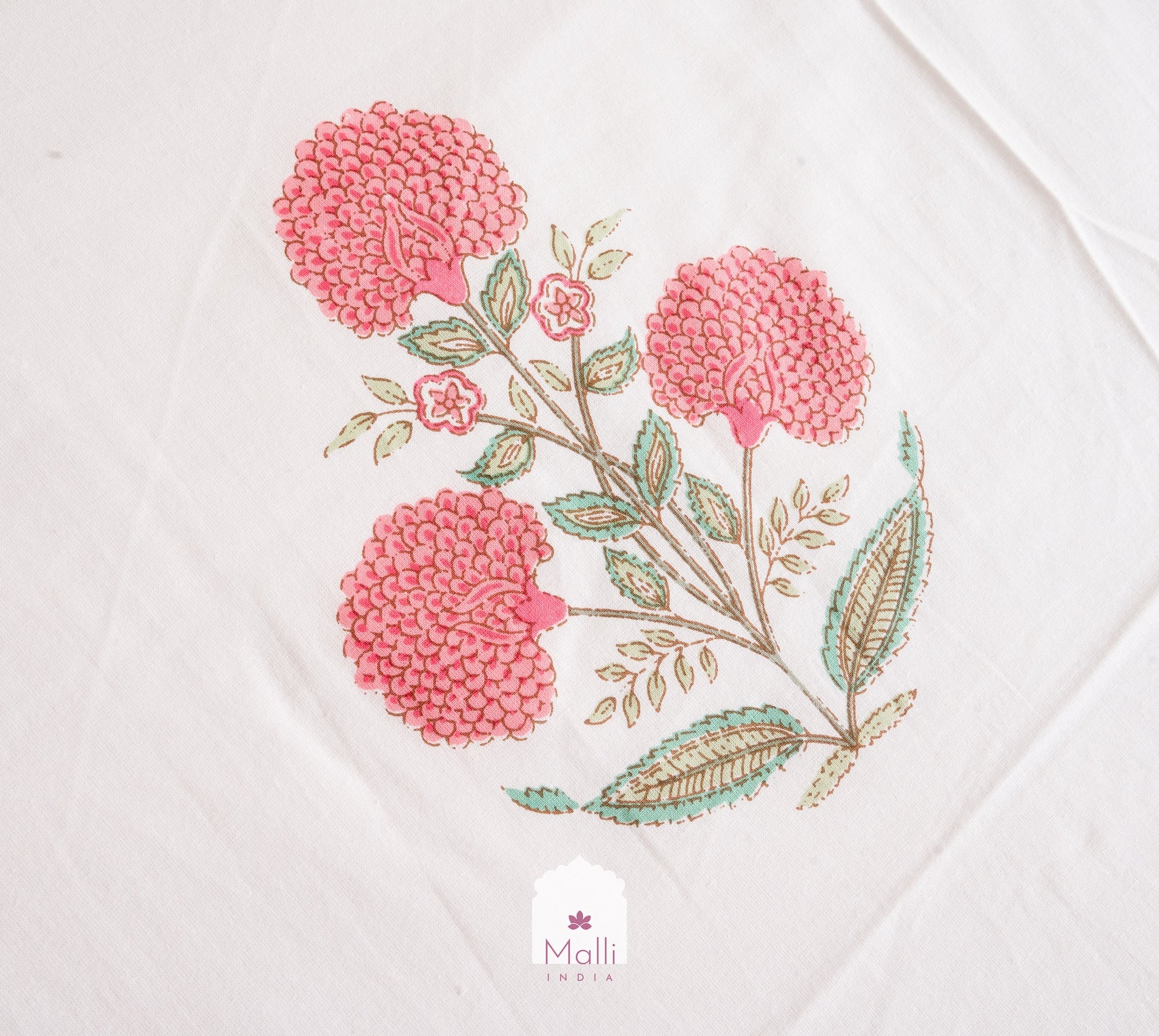 Pink chrysanthemum palm buti with green border - Pure cotton double bedsheet handblock printed