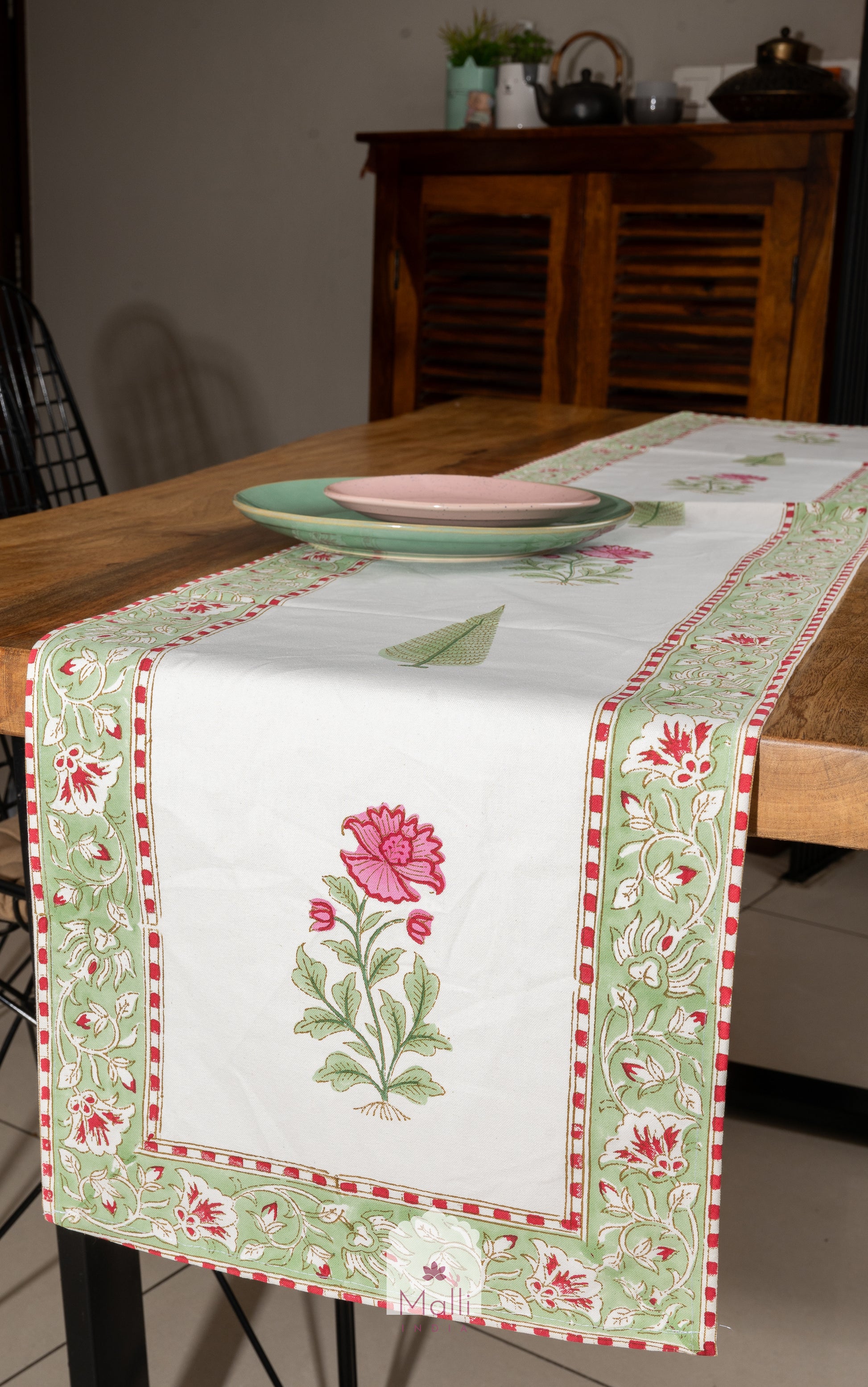 Pink & green florals - 6 seater runner in canvas cotton