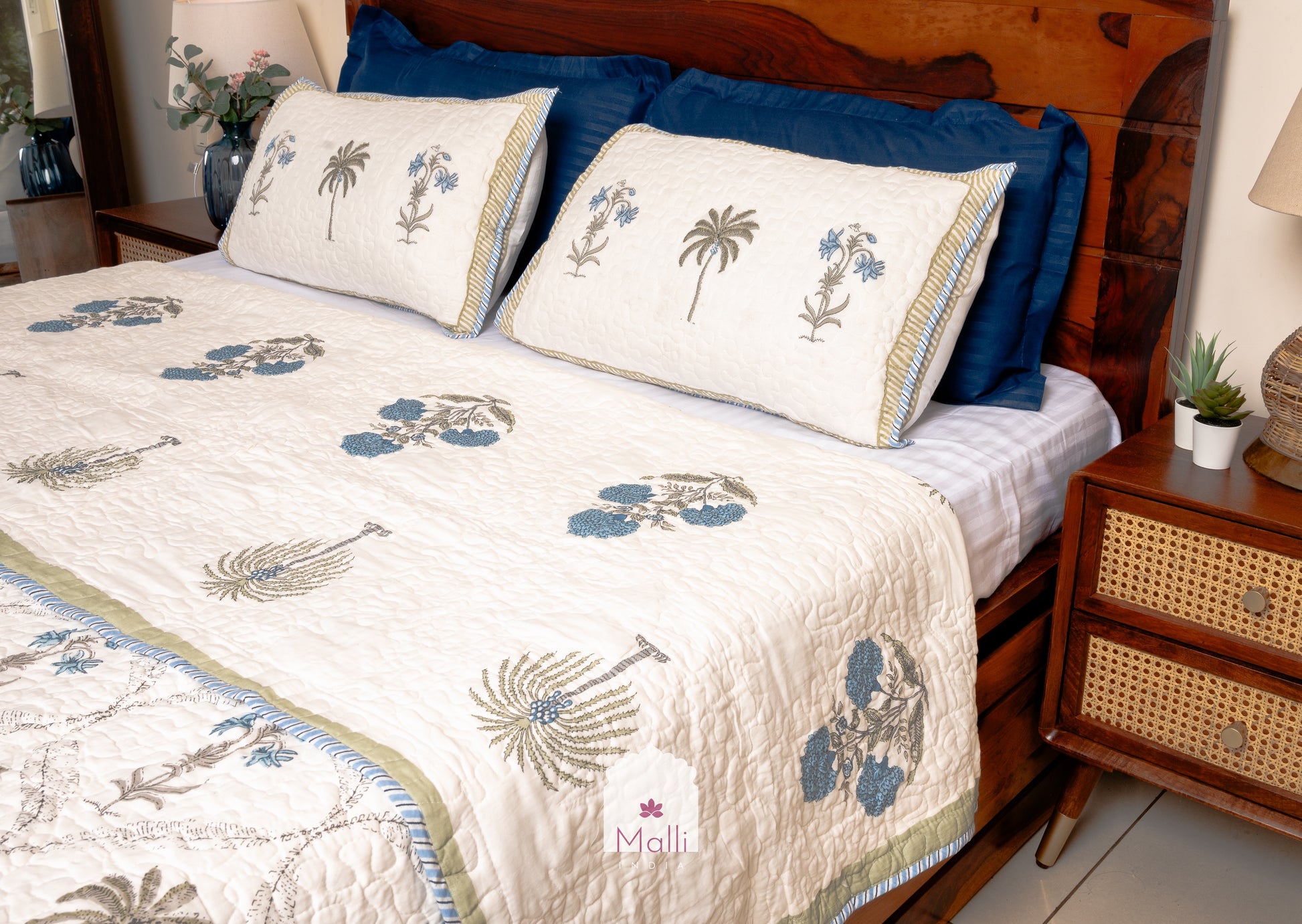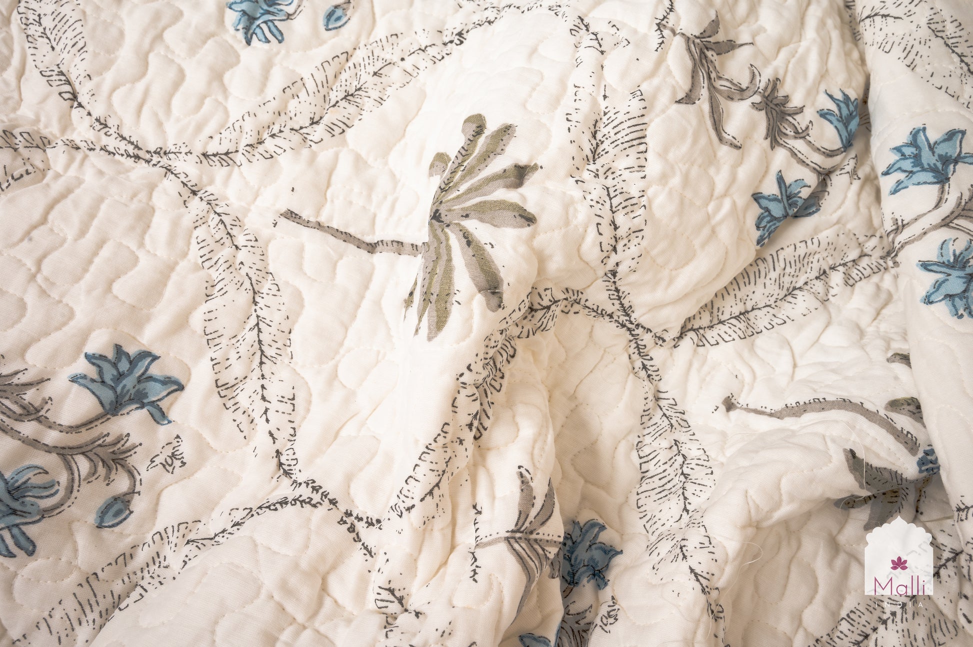 Tulip jaal with marigolds - Quilted reversible bedcover in pure mulmul cotton