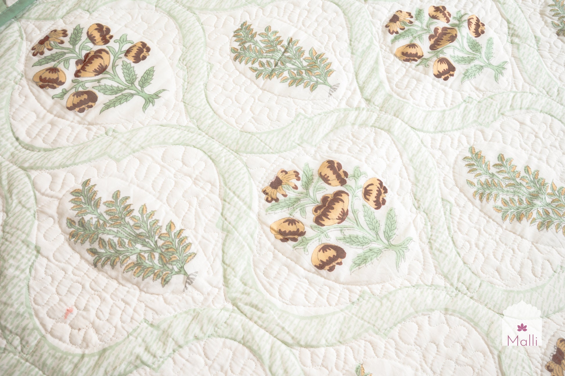 Brown daisy jaal - Quilted reversible bedcover in pure mulmul cotton
