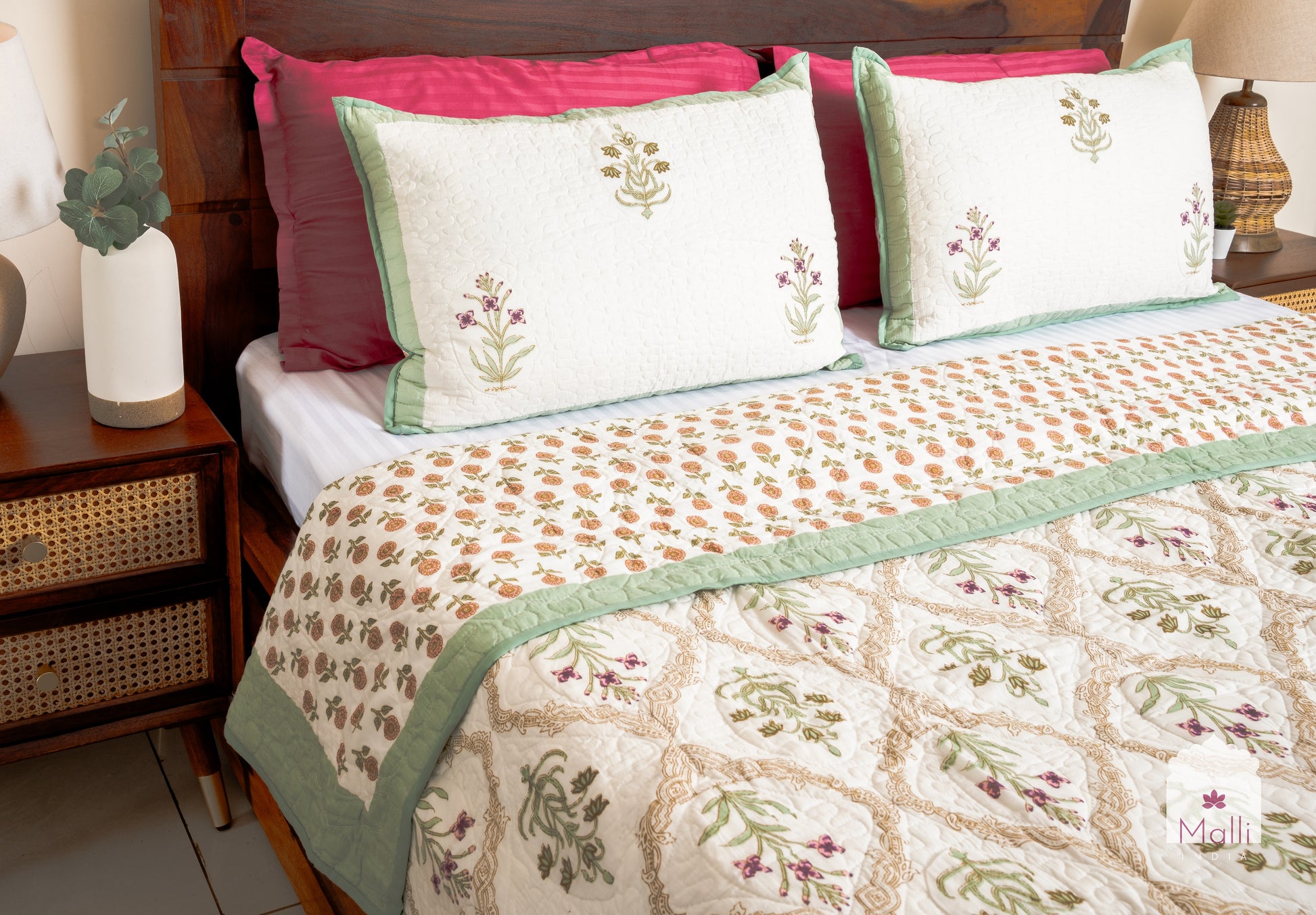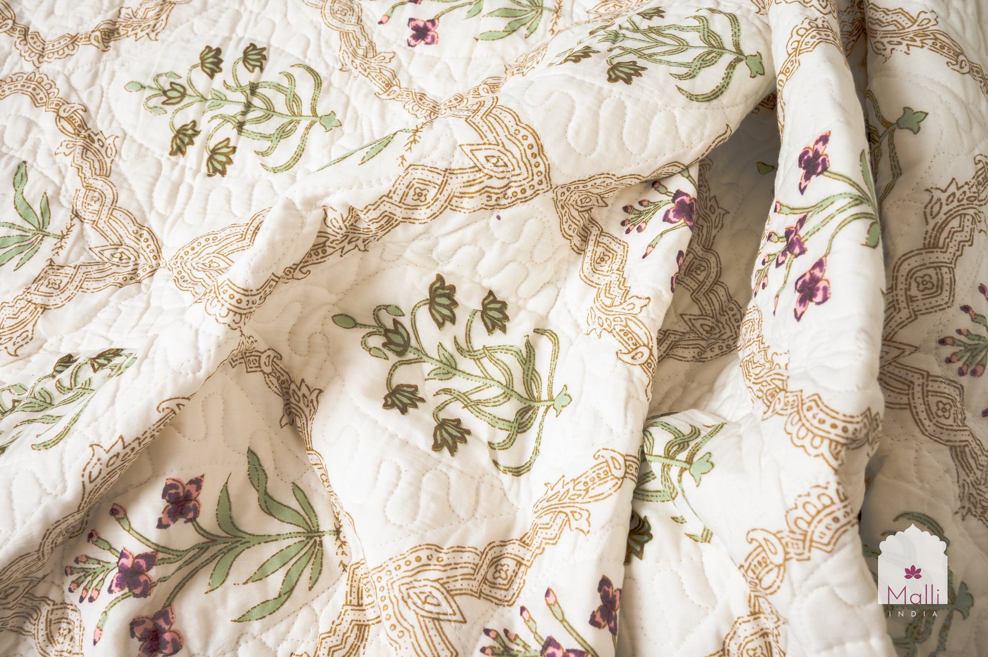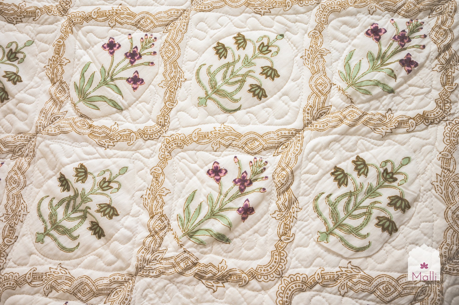 Pink madhumalti jaal - Quilted reversible bedcover in pure mulmul cotton