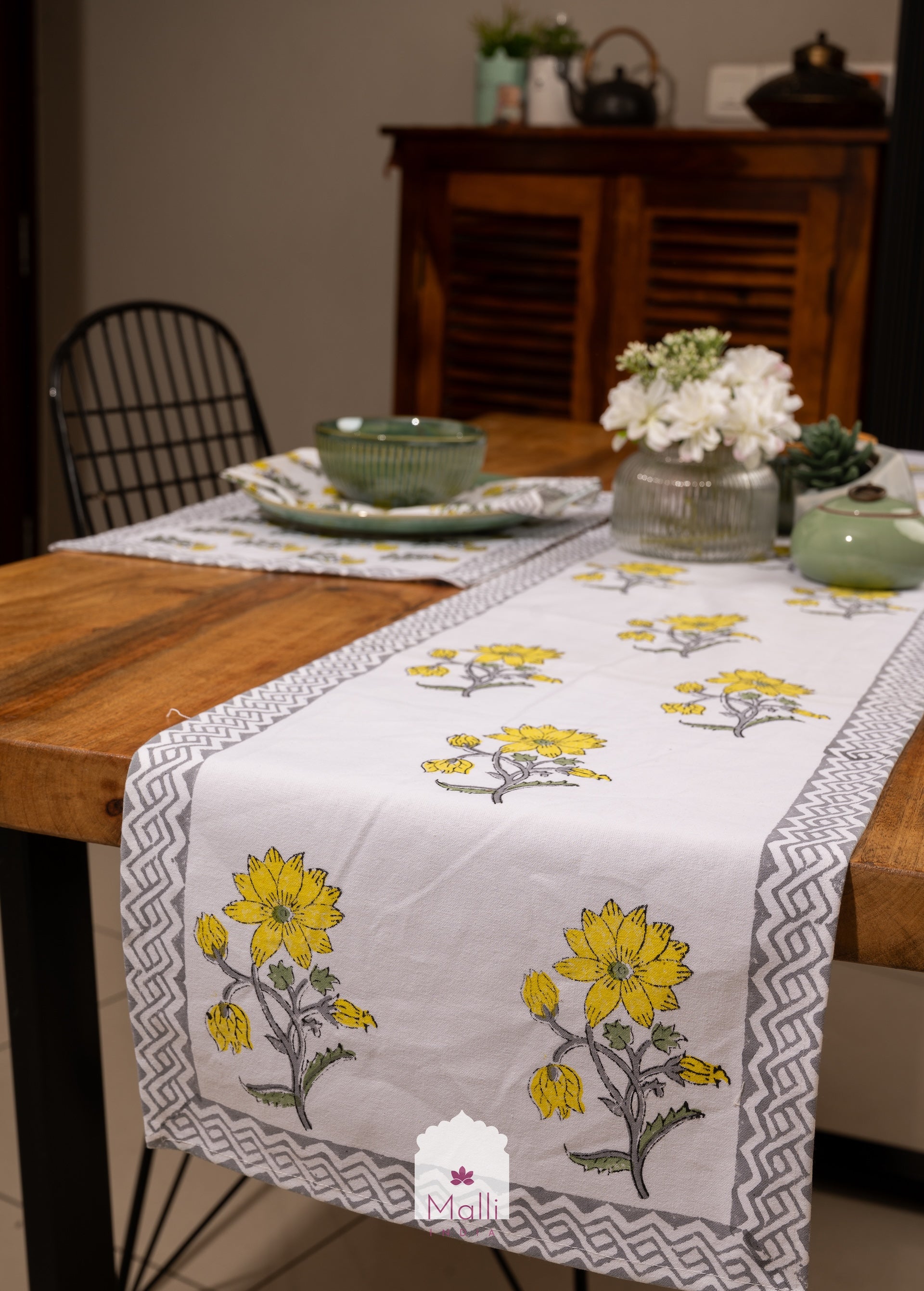 Yellow dahlia buti - Runner, placemat & napkin set for 6 seater